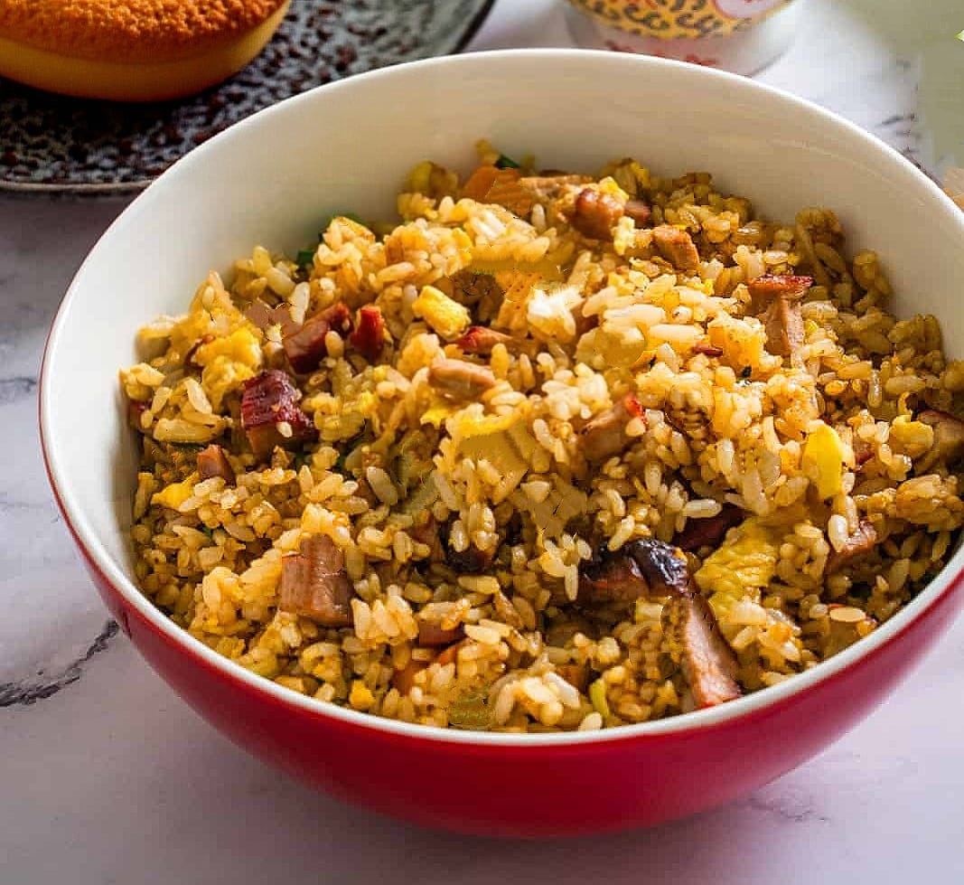 Fragrant wok-fried rice tossed with vegetarian char siew, fresh vegetables, and savoury seasoning.